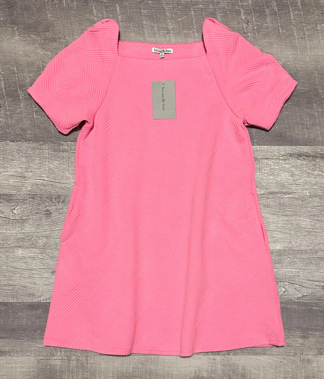 See and be Seen Puff Sleeve Relaxed Fit Casual Mini Dress This textured dress features a unique U-neck and convenient side pockets, while the short tucked sleeves, band cuffs, and vented hemline elevate the basic style. Whether dressing up or keeping it casual, this dress offers both versatility and comfort. - Slightly lighter pink in person - Dress is a relaxed fit - 97% Polyester / 3% Spandex - Machine Washable SIZE: Womens Small CHEST underarm to underarm: approx. 19" LENGTH shoulder to hem: approx. 36" SLEEVE top of shoulder to cuff: approx. 12" CUFF: approx. 6" HEM: approx. 26" CONDITION: NEW with tags still attached. 2108-15-03 Summer dress, summer fashion, Barbiecore, mini dress, simple, basic dress, girly, casual chic, shift dress