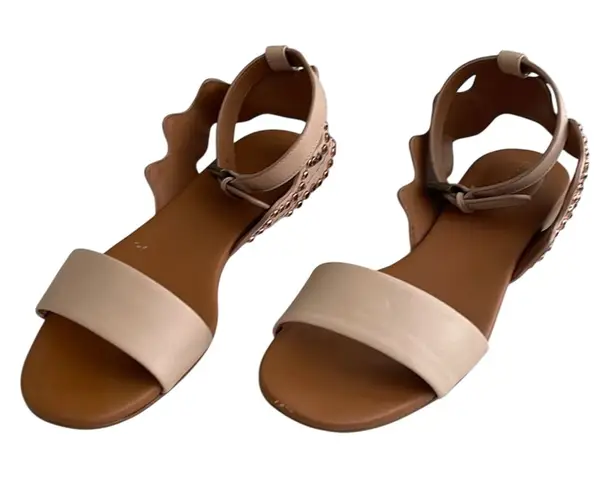 See By Chloe tan leather flat sandals featuring a studded scalloped trim and adjustable ankle strap. The comfortable footbed and stylish design make these sandals perfect for everyday wear or a chic vacation. Condition- excellent used condition- all stone are in place, leather upper is excellent. See last two pictures for footbed and edge of the shoe for minor issues with the leather that shouldn't be noticeable while being worn. According to the size chart 38.5= 8.5 Style: Strappy Department: Women Upper Material: Leather UK Shoe Size: 5.5 AU Shoe Size: 7.5 Heel Style: Flat EU Shoe Size: 38.5 Features: Straps, Adjustable Strap, Ankle Strap, Comfort, Cushioned Closure: Buckle Pattern: Solid Accents: Studded, Stone, Scalloped Heel Height: Flat (Under 1 in) Type: Sandal Keywords: See By Chloe sandals, stud embellishments, scalloped edge, tan leather, ankle strap, designer flats, summer footwear, bohemian chic, European size, casual elegance, travel shoes, resort wear