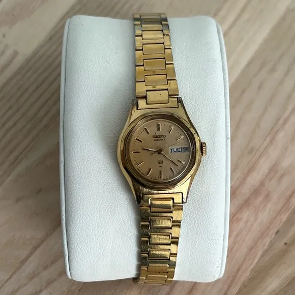 Brand: Seiko Model: 8523-0049 Gender: Ladies Description: Gold tone bracelet, dial, hands, and markers. Dial has day date window. Just cleaned and serviced with a new battery installed. Condition: Good, expected wear on bracelet and crystal. Band/Bracelet Type: Gold Tone Stainless Steel Date Window?: Yes Power Type?: Quartz, Battery New Fresh Battery Installed?: Yes Box?: No Additional Links?: No Notes: Please see pictures for condition and measurements. Watch pillow are for photography staging only and are not included, unless otherwise stated. From a smoke free, pet free home. Condition Notes: -NWOT: New Without Tags. Brand new item. May have super light handling marks, if any. Item may have been a window display item for a short time before safe storage. -Like New: Extremely minor handling or wear marks, if any. Item may have been worn once or twice. -Excellent: Minor, but more noticeable light wear marks on band, case, and/or very light scratches on crystal, if any. -Great: Above average condition for the age of the watch. Light to moderate surface wear or scratches. Watch is in great working order. -Good: Expected wear marks for typical standard use for the age of the watch. Noticeable surface scratches on band, case, and/or crystal. Watch is in good working order. Watch need additional cleaning/polishing. -Other: Will be described if applicable. Watch may not be functional, have damage, or need major repairs.