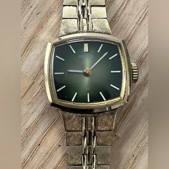 Brand: Seiko Model: 11-3679 case back, 11-1940R case back Gender: Ladies Description: Beautiful rare vintage watch. 1970’s era. Gold plated case and green emerald color dial. White and gold-tone hands and markers. Gold plated bracelet. Just cleaned and serviced with a new battery installed. Works well! Small inscription on case back. Condition: Great-excellent vintage condition. Band/Bracelet Type: Gold plated metal Date Window?: No Power Type?: Mechanical winding New Fresh Battery Installed?: N/A, no batteries! Box?: No Additional Links?: No Notes: Please see pictures for condition and measurements. Mechanical watches are shipped in good working order, unless otherwise stated. However, due to different shipping practices with USPS, they may pick up magnetization and may require additional servicing to run properly once received. From a smoke free, pet free home. Condition Notes: -NWOT: New Without Tags. Brand new item. May have super light handling marks, if any. -Like New: Extremely minor handling or wear marks, if any. Item may have been worn once or twice. -Excellent: Minor, but more noticeable light wear marks on band, case, and/or very light scratches on crystal, if any. -Great: Above average condition for the age of the watch. Light to moderate surface wear or scratches. -Good: Expected wear marks for typical standard use for the age of the watch. Noticeable surface scratches on band, case, and/or crystal. -Other: Will be described if applicable.