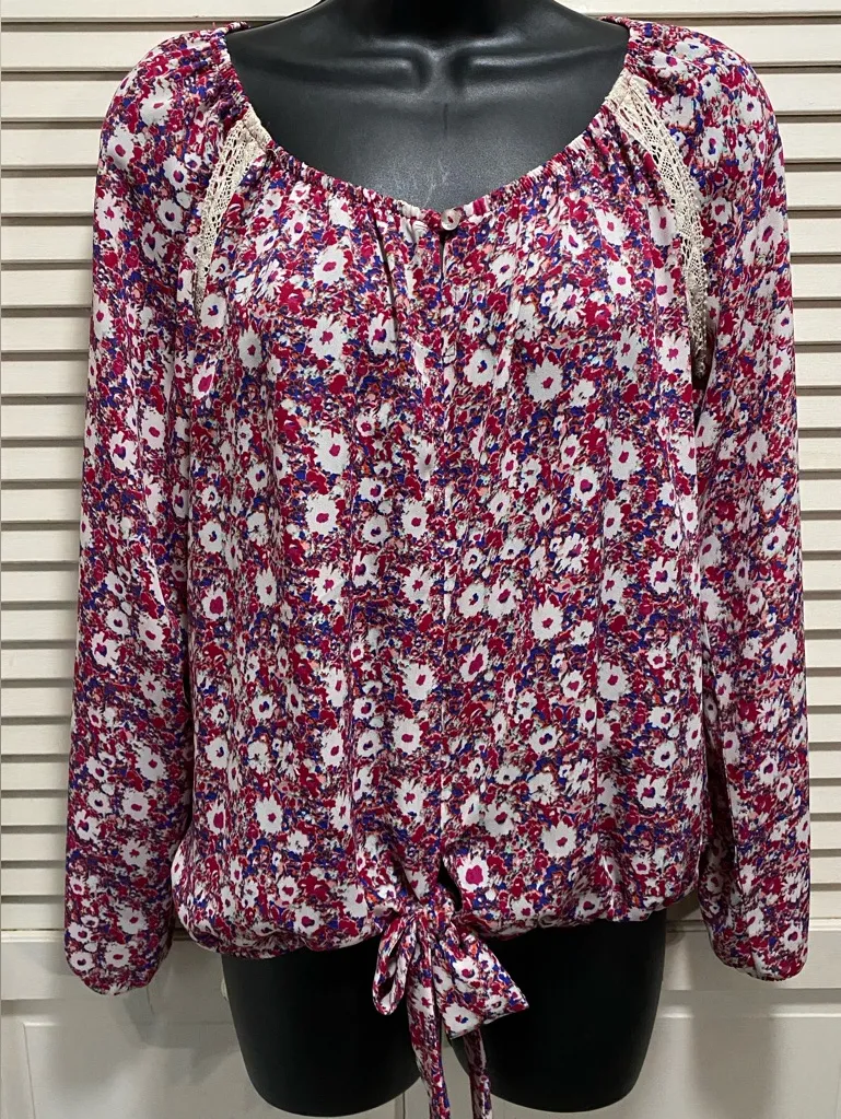 This beautiful Self Esteem blouse is perfect for any occasion. The delicate crochet and floral pattern add a touch of bohemian style, while the tie waist and elastic hem ensure a comfortable fit. The blouse features a boat neck and keyhole neck, with a collarless design that is perfect for both casual and formal occasions. It has a measurement of 21” pit to pit & 23” length. Made from lightweight chiffon fabric, this blouse is easy to care for and suitable for all seasons. The long sleeves and casual sleeve type provide coverage without sacrificing style. This blouse is machine washable and comes in a beautiful pink, white, and blue color combination. (0633)