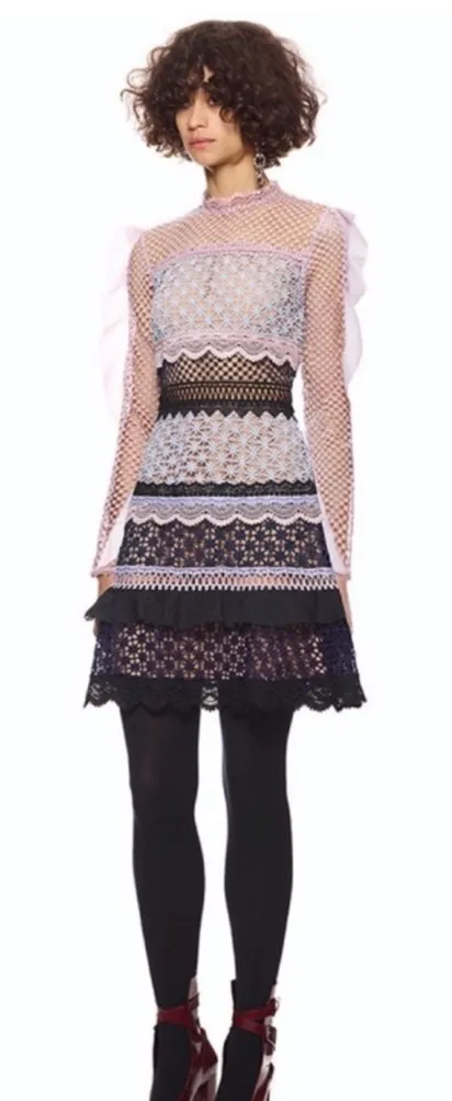 Self-Portrait Bellis Lace Trim Mini Dress! Crafted from intricate, multi-colored guipure lace panels, this dress is perfect for cocktail events, parties, or special occasions. Product Details Brand: Self-Portrait Style Name: Bellis Lace Trim Mini Dress with Frilled Sleeves Color: Multi-color (Pale blue, pink, black, purple) Design: Fit-and-flare silhouette with a high neckline and exposed back zipper closure. Features sheer ditsy mesh long sleeves and ruffled trims on the shoulders and skirt. Material: Shell: 100% polyester; Trim: 100% polyamide (guipure lace and mesh fabric). Fully lined in nude mesh. Original Retail: Approx. $545 - $589 USD (depending on the retailer). Condition & Sizing Size: US 6 (UK 10) Condition: Excellent, like new condition, without tags (NWOT). No flaws, stains, or signs of wear. Fit: Designed to be fitted through the bust and waist with a flounced mini skirt. Approximate Measurements (Laid Flat): Bust (pit to pit): ~17 inches (34" around) Waist: ~13 inches (26" around) Length (shoulder to hem): ~35 to 36 inches Style : Fairycore Romantic Princesscore Cottagecore Dreamcore Whimsical Ethereal Guipure lace