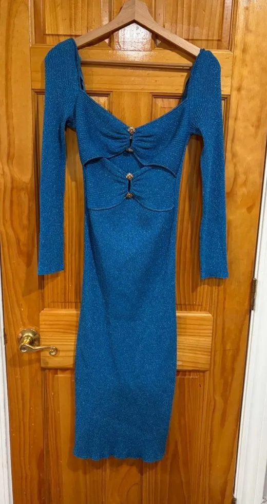 Striking Self-Portrait knit midi dress in a vibrant metallic blue lurex fabric. Features a flattering sweetheart neckline, ruched bust detailing with signature gold-tone hardware accents, and a center cut-out design. Long sleeves and a sleek midi silhouette make this a standout choice for evening wear, parties, holidays, or special occasions. Details: Brand: Self-Portrait Color: Blue (metallic lurex) Style: Sweetheart neckline, cut-out front Length: Midi Sleeves: Long sleeve Fabric: Lurex knit (stretch) Size: XL Made in: Manufactured 2022 Condition: Very good pre-owned condition. No holes, stains, or pulls noted. Fabric retains strong shimmer and stretch. Notes: All measurements are approximate. Colors may vary slightly due to lighting and monitor settings.