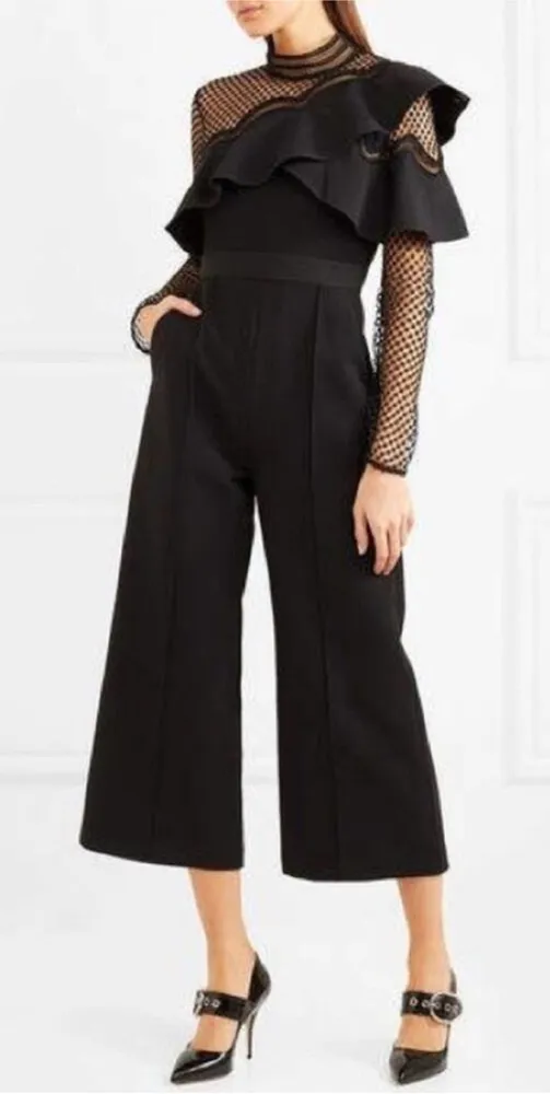 Great used condition! Some discoloration around neckline from makeup as pictured. Self Portrait Mock Neck Cropped Wide Jumpsuit Lace trim yoke and sleeves with asymmetrical ruffle trim. Long sleeves, back zip, side slit pockets, polyester. Size 8 Inseam: 24” Party, neutral, solid, holiday, wedding guest, goth, long sleeve, feminine, wide leg, luxury, maximalist