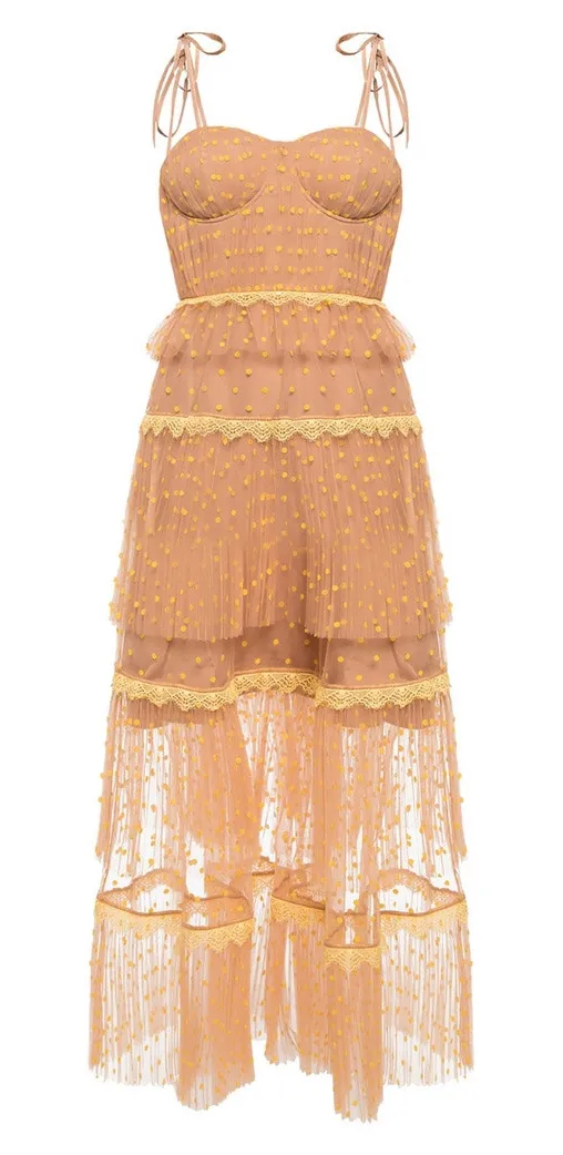 Size-4 Color-Tan Nude/Yellow Fabric-tulle, nylon under skirt lined Key Features-tiered skirt,... Show more