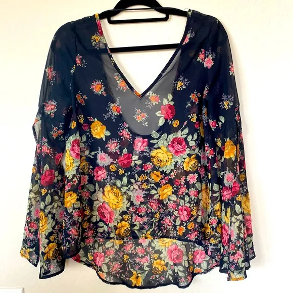 Beautiful black blouse with pink, red and golden floral print that is semi sheer. The front of the blouse is a v-neck and the back is rounded scoop with a black string across the top. The back also hangs down longer. The standout part of this blouse is the sleeves. They split open about a 1/4 of the way down making it flowy like a butterfly. Simply stunning. Front: shoulder to bottom hem 23” Back: shoulder to bottom hem 29” Shoulder to bottom of sleeve 24” Armpit to armpit 19”