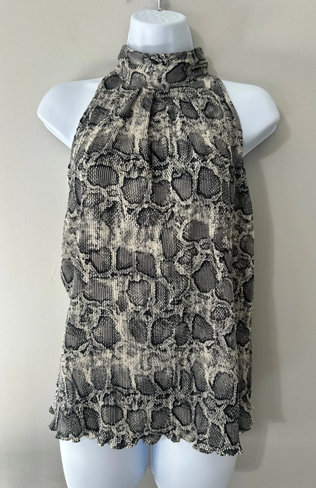Type: Blouse Department: Women Material: Polyester Neckline: Mock Neck Sleeve Length: Sleeveless Sleeve Type: Cap Sleeve Accents: Pleated Pattern: Animal Print Features: Keyhole Neck Fit: Regular Keywords: snakeskin print, pleated blouse, mock neck top, sleeveless blouse, tank top, sen blouse, animal print top, womens top, designer blouse, dressy top, casual blouse, xs blouse, black and beige top, fashion top, stylish blouse All pre owned clothing will be cleaned according to care instructions with unscented detergent. All items stored in polybags Comes from a smoke free home
