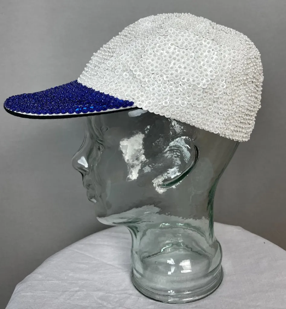 JC sequined baseball hat in white and blue with light stretch in the back band. Estimating to be a u... Show more