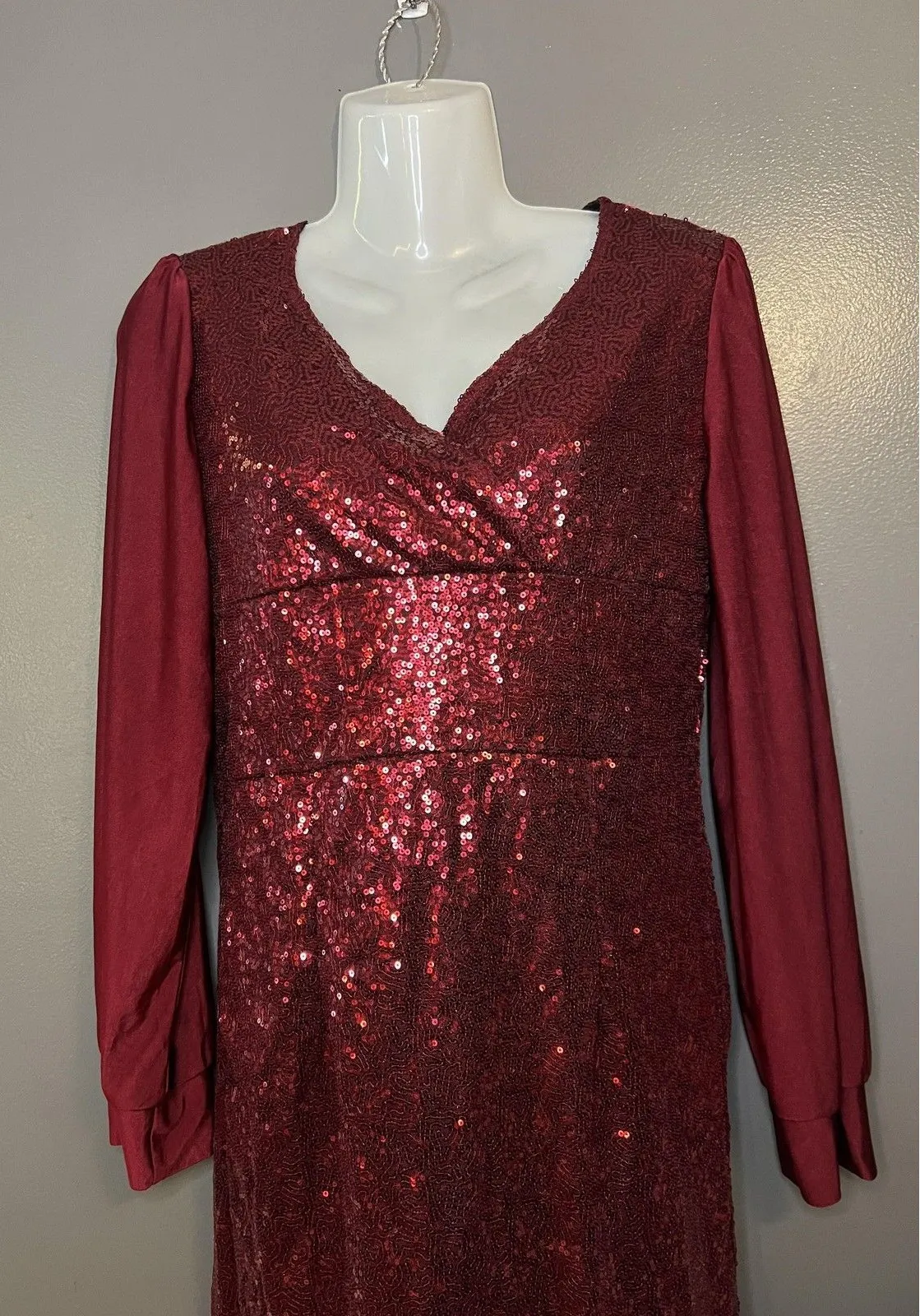 Pre-owned dress shows light general wear with some minor wrinkling to the solid fabric hem. Sequins appear largely intact without obvious missing patches or holes. Side zipper functions properly and no stains or tears are noticeable on inspection. Brand: Unknown (no brand label visible). Item: Womens long sleeve sequin evening dress with a rich burgundy red color and flattering V-neckline. Color: Burgundy / deep red with matching solid sleeves and solid lower hem panel. Materials: 90% polyester, 10% spandex (per care tag). Design details: Dense allover sequins on the front and back bodice and upper skirt, textured sequin pattern at the top, solid woven long sleeves with gathered shoulders and cuffed ends, side zip closure, and a flowy flared hem for added movement. Back features a higher round neckline with the same sequin detailing as the front bodice. Size: Estimated Womens Small (no size tag; please compare to your own garments). PTP 17" Length 44" bin 31 1952