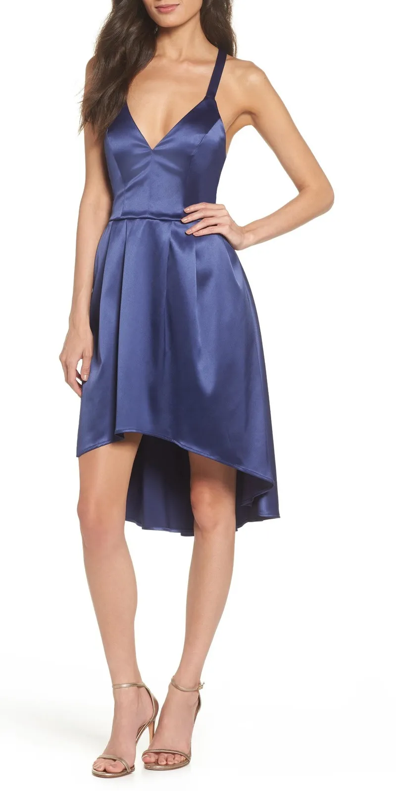 A navy blue satin formal dress with a high low hemline and V-neckline. This dress features a flatter... Show more
