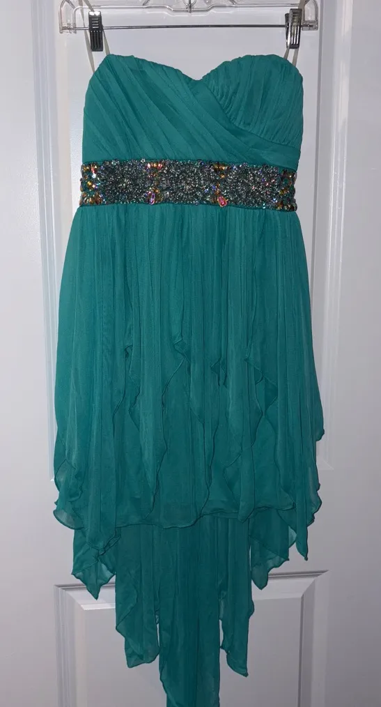 Elegant strapless prom dress by Sequin Hearts. Features a teal chiffon overlay with a beaded waistli... Show more