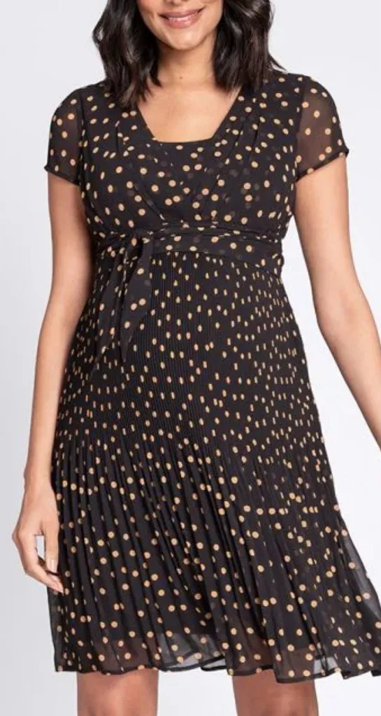 Seraphine dress features a black chiffon overlay with warm gold polka dots and a softly pleated skirt. Designed for both pregnancy and postpartum wear, it includes a discreet nursing-friendly wrap bodice while maintaining an effortlessly elegant silhouette. Comes with sash belt. Excellent preowned condition ▫️Armpit to armpit-19” ▫️Waist-15” ▫️Length-37” Measurements are approximate Maternity, postpartum, nursing friendly, classic, feminine, romantic, get together, brunch, date night