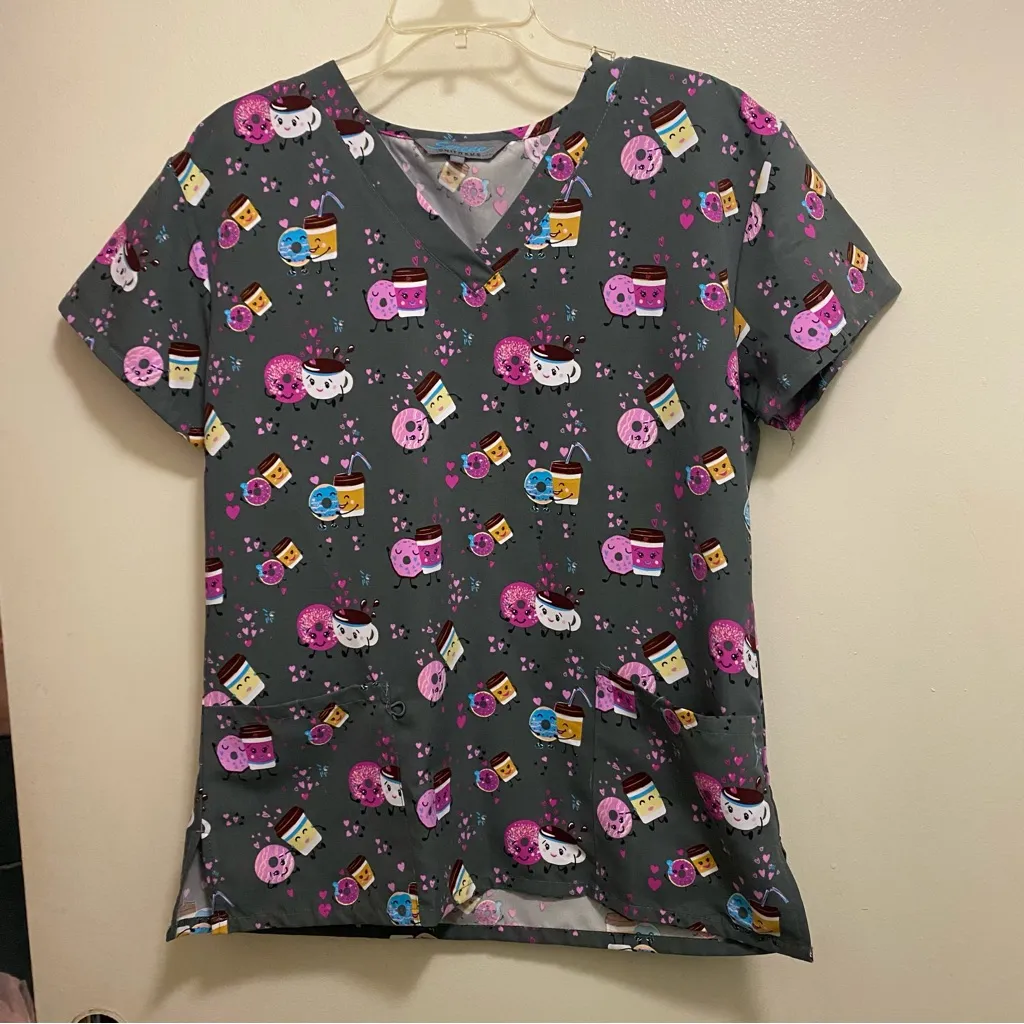 Gray scrub top featuring a playful pink donut print. Perfect for adding fun to your work attire. Excellent condition with no wear, fading , stains or damages Soft and smooth 100% polyester Pit to pit across is 20” for bust measurement of 40” Length 28”