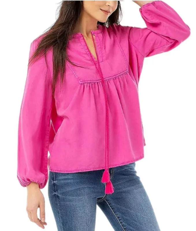 Serra Retreat Womens Lyocell Beachy Boho Point Mugu Peasant Blouse in Hot Pink. Size 1X. Good preowned condition. No visible flaws. - Front Slit Neckline with Tassel Ties - Balloon Long Sleeves - Elastic detail at cuffs - Center-front Shirring - 100% Lyocell Tags- Barbiecore Peasant Casual Boho Work Leisure Beachy Lightweight Approximate Measurements While Laying Flat: Pit To Pit: 23" Length: 28" All Items Come From A Smoke Free Home ! All Reasonable Offers Welcome !