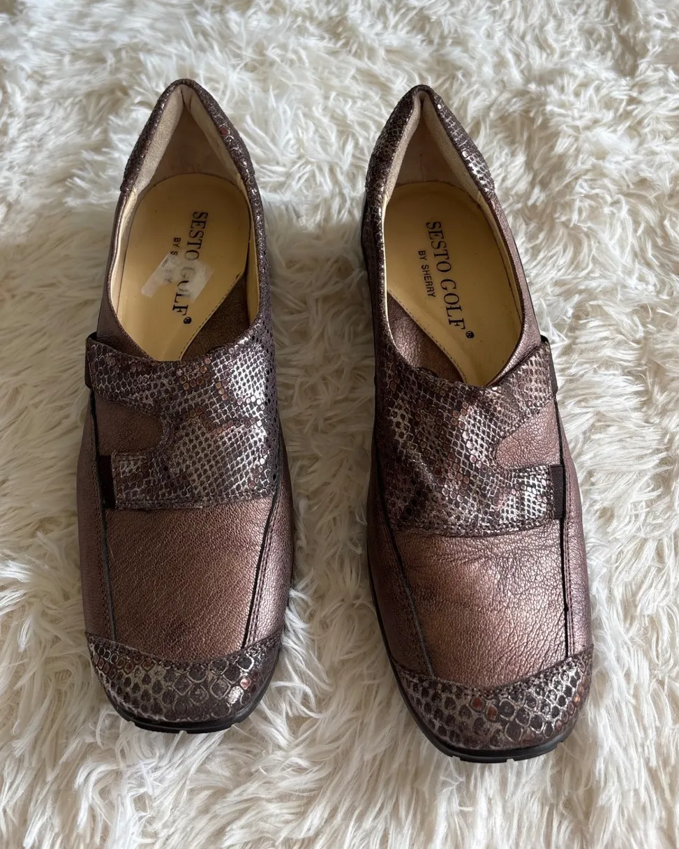 Italian craftsmanship meets everyday comfort in these stunning brown slip-on shoes. A subtle shimmer catches the light with every step, lending a touch of luxury to this practical design. The unique snake-embossed leather adds texture and visual interest, elevating these shoes beyond basic. The low-profile design provides all-day comfort, while the distinctive sole offers excellent traction. These shoes would be perfect for a casual office environment, weekend errands, or a comfortable travel day. NEW Retail: $249 Style: Slip-On Color: Brown Type: Flat Upper Material: Leather Model: Sesto Meucci Slip On Heel Height: Flat (Under 1 in) Keywords: Sesto Meucci, Brown Shoes, Slip On Shoes, Comfort Shoes, Leather Flats, Snake Embossed, Casual Shoes, Everyday Shoes, Walking Shoes, Narrow Width, 7.5 N, Metallic Shoes, Italian Design, Comfort Flats