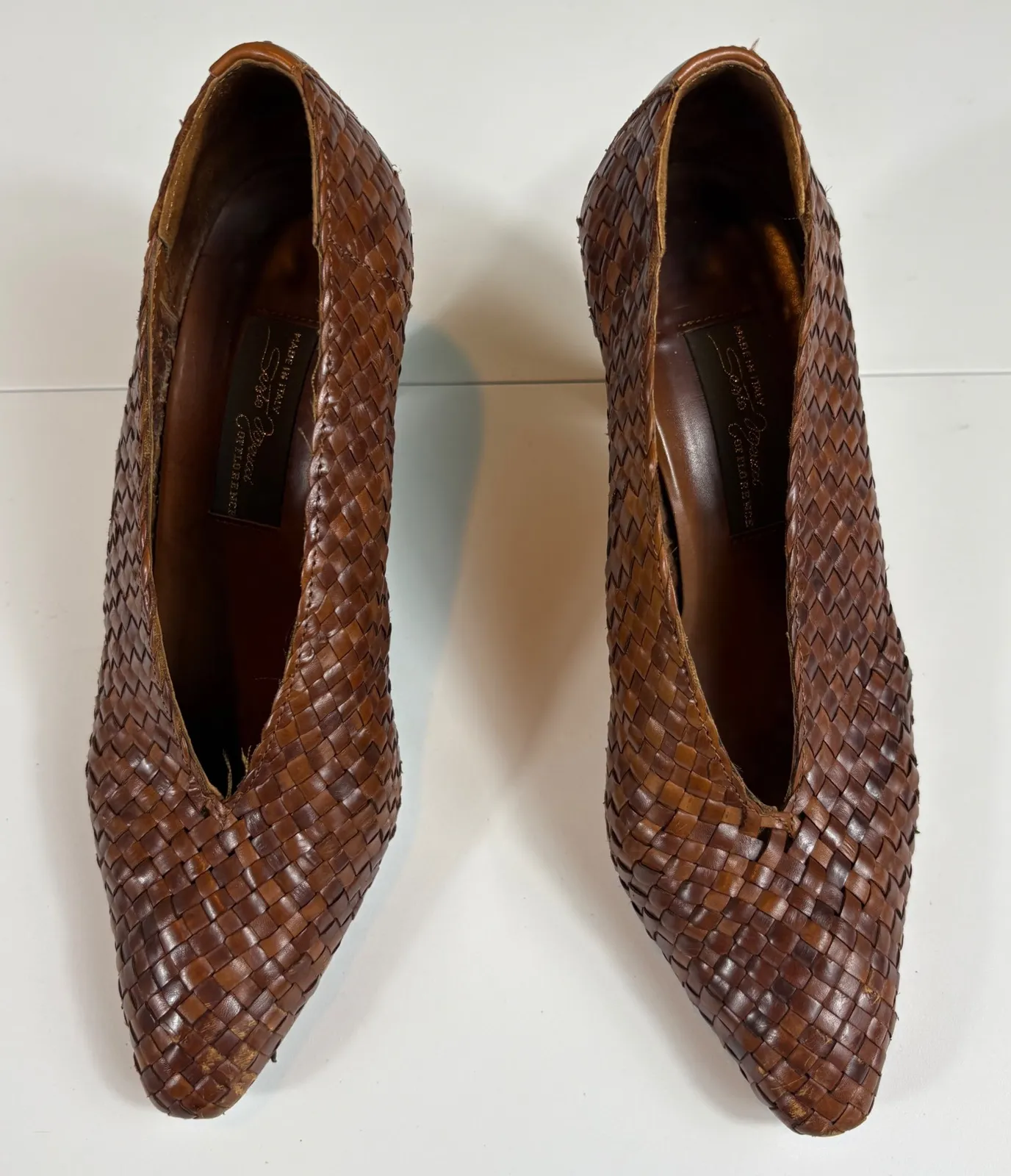 Woven leather pointed toe heels crafted in Italy by Sesto Meucci. These elegant pumps feature a sophisticated woven leather upper and a classic silhouette, offering timeless style. The leather insole and durable sole ensure comfort and longevity, making them a versatile addition to any wardrobe. Sesto Meucci heels, women's woven leather shoes, Italian designer heels, pointed toe pumps, vintage Sesto Meucci, leather woven shoes, classic heels, elegant pumps, made in Italy shoes, designer heels size 5.5, woven leather pumps