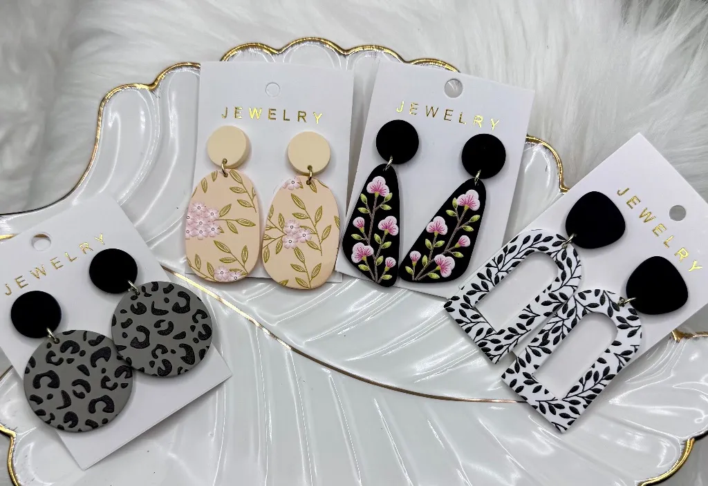 Set of four stylish earrings featuring floral and animal print designs. Includes colors like black, white, cream, and pink. You get four pair of earrings, the ones that are in these photos Length of them ranges from 2 inches to 2.5 inches