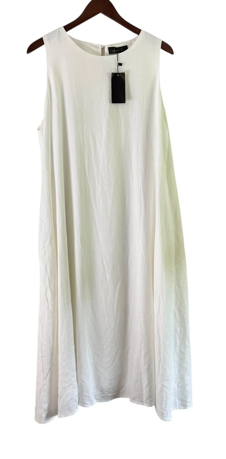 Effortless elegance arrives in this breezy, sleeveless dress, perfect for warm-weather days. The dress features a relaxed, flowy silhouette that drapes beautifully, offering both comfort and style. Its simple yet chic design makes it versatile for various occasions, while the lightweight fabric ensures breathability and ease of movement. The neutral color palette allows for easy accessorizing, making it a wardrobe staple. Ideal for a casual brunch with friends, a day of shopping, or a relaxed evening stroll, this dress is a must-have for those seeking understated sophistication. Measurements: * Pit to Pit: 23" * Shoulder to Hem: 46" Style: A-Line, Tank Dress, Sundress, T-Shirt Dress Dress Length: Midi Color: Beige Department: Women Sleeve Length: Sleeveless Pattern: Solid Occasion: Casual, Travel Material: Linen Blend, Viscose, Polyester Neckline: Round Neck Fabric Type: Woven Character: Boho, Casual Chic, Beach, Summer, Neutral Keywords: Seta T dress, sleeveless dress, casual dress, linen blend dress, flowy dress, cream dress, XL dress, summer dress, boho dress, midi dress, tank dress, vacation dress, beach dress, neutral dress