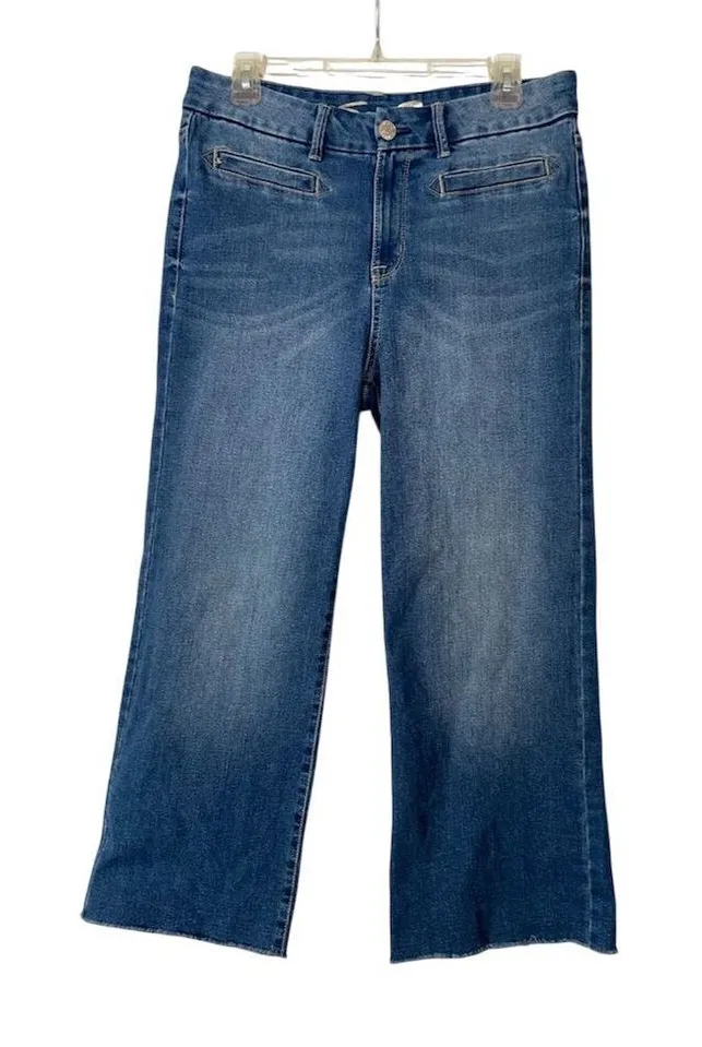 These Seven 7 Jeans in size 6 feature a wide-leg style and are designed for women. The Grammercy Wide Leg Gauchos come in a medium wash blue denim, offering a high-waist fit with a cropped length and raw hem detailing. Made from a blend of cotton, polyester, and spandex, they provide a regular fit with a high rise greater than 10.5 inches. The jeans have a zip closure and are machine washable. They are in excellent pre-owned condition with no flaws.