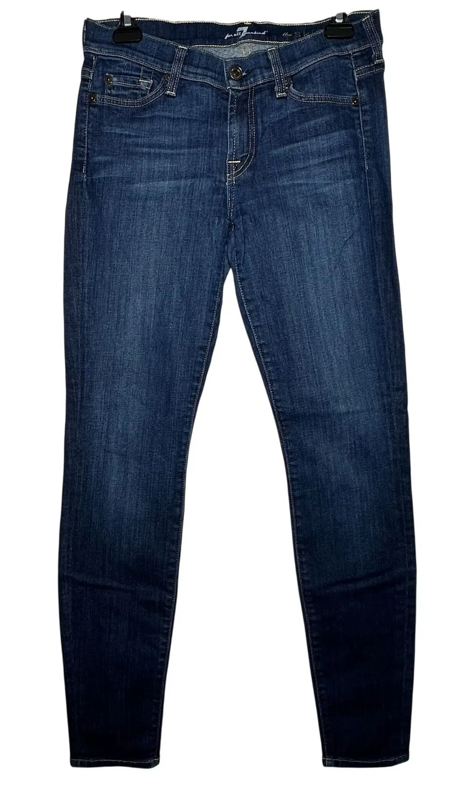 Seven For All Mankind The Skinny jeans in a dark wash. These mid-rise jeans feature a stretch fabrication for a comfortable and flattering fit. The classic five-pocket styling and branded hardware complete the look. Measurements: • Waist: 14 in • Inseam: 29 1/2 in • Rise: 8 in Style: Skinny Department: Women Fabric Wash: Dark Waist Size: 28 in Type: Jeans Accents: Logo, Button Features: Stretch, Distressed Fit: Slim Pattern: Solid Rise: Mid (8.5-10.5 in) Fabric Type: Denim Inseam: 29 in Material: Cotton, Spandex, Cotton Blend Closure: Button Model: the skinny Product Line: 7 For All Mankind Keywords: Skinny jeans, Seven For All Mankind, dark wash, mid rise, stretch denim, classic denim, designer jeans, everyday wear, basic denim, slim fit, premium denim, essential jeans Fast shipper- most items ship within 1 day!