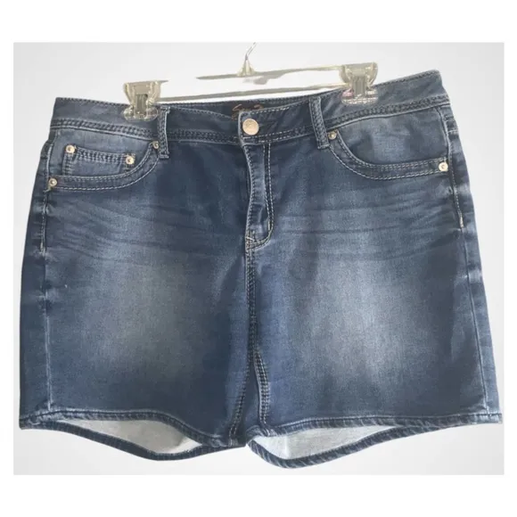Excellent Condition Seven7 Blue Faded Denim Mid Rise Straight Hem Shorts Size 14 Cotton, polyester and spandex Machine washable Size 14 Approximate measurements laying flat 19” waist 9” rise 6” inseam Chic blue denim shorts by Seven7. Features stylish stitching and a comfortable fit.