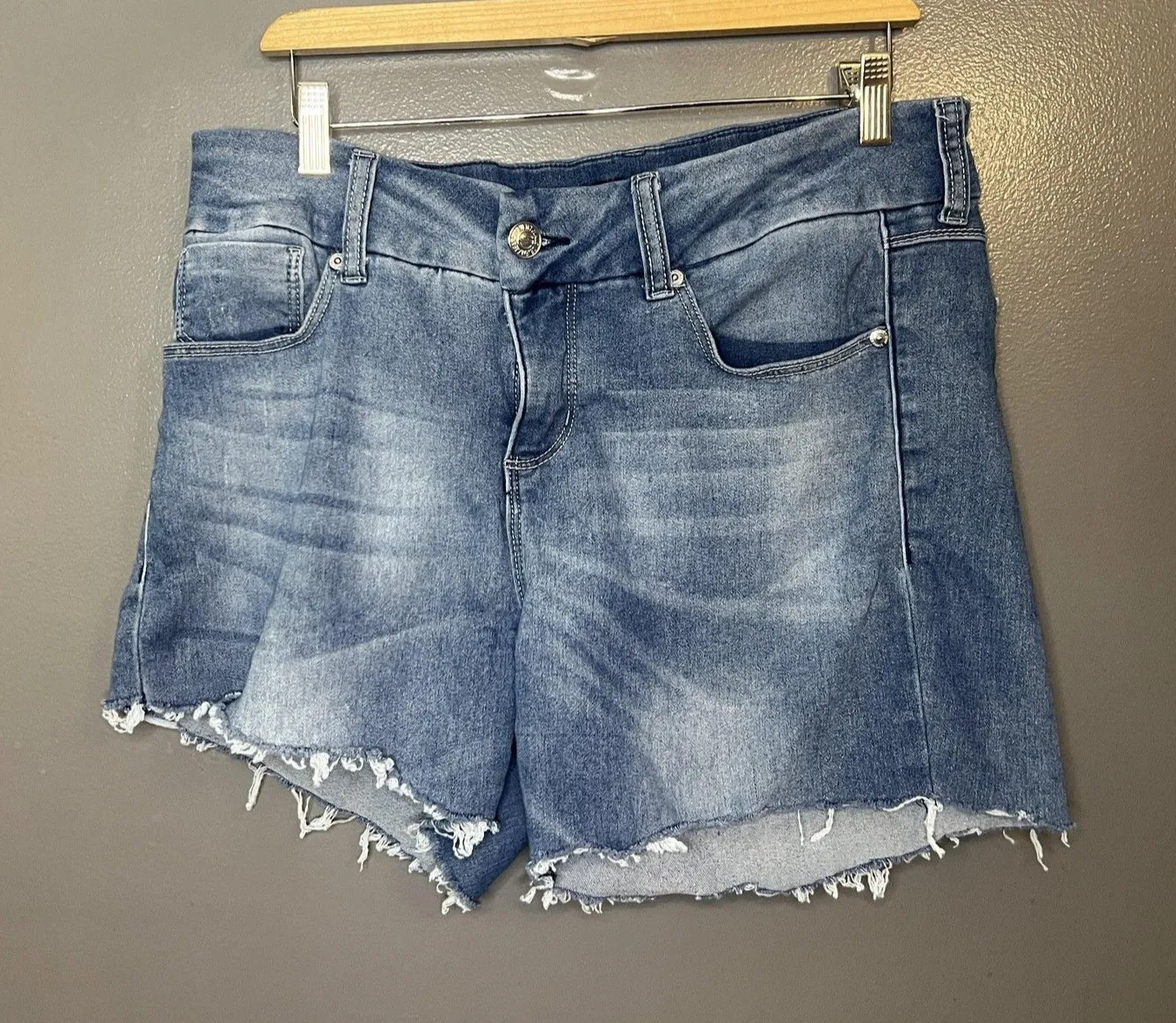 Gently worn with light wash fading. Fabric, stitching, zipper, and button all intact. Raw hem intentionally frayed. Brand: Seven7 Style: Womens denim shorts with a skinny jean-inspired fit and cutoff raw hem. Color: Medium blue wash with light fading and whiskering. Size on tag: 12 (Womens) Materials: 68% cotton, 30% polyester, 2% spandex for stretch and comfort. Made in China. Details: Five-pocket styling, zip fly with button closure, belt loops, embroidered back pockets, metal logo hardware, frayed raw hem for a casual look. Waist 34" has alot of stretch Rise 10" Inseam 5" bin 59 2220