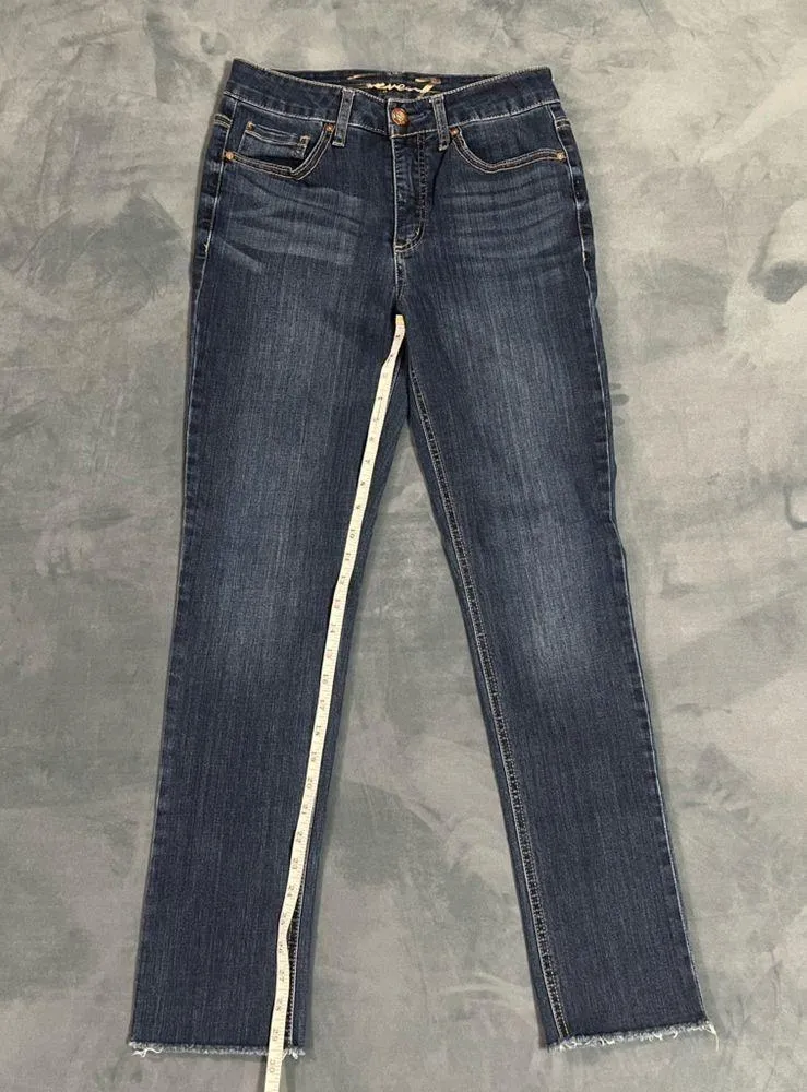 EUC Seven7 jeans, dark wash, straight leg without any detailing on the rear/back pockets, wisker detailing on the front of the jeans with a manufactured, distressed hem. They have some stretch to them as well. Materials: 67% Cotton, 32% Polyester and 1% Elastane