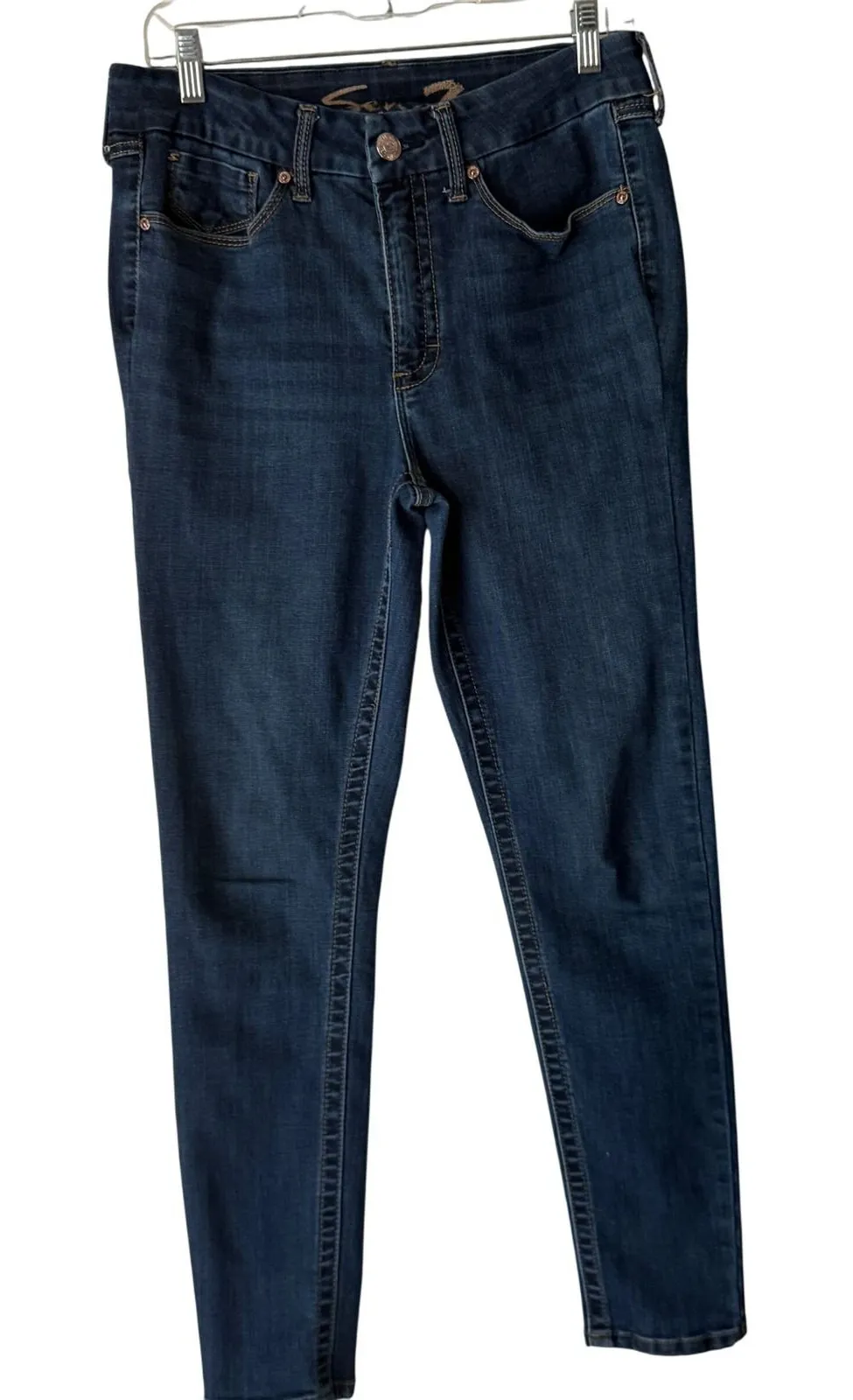 Seven7 Tummyless High Rise Skinny Jeans in a dark wash. These jeans offer a flattering high-rise fit and a sleek skinny silhouette. Designed for comfort and style, they are perfect for everyday wear or a night out. Measurements: • Waist: 30 in • Inseam: 29 in High Rise Style: Skinny Department: Women Fabric Wash: Dark Waist Size: 30 in Accents: Logo, Button Type: Jeans Features: Stretch, Slimming, Pockets, Comfort Fit: Slim Pattern: Solid Rise: High (Greater than 10.5 in) Fabric Type: Denim Inseam: 31 in Material: Cotton Blend, Spandex Closure: Button, Zip Keywords: skinny jeans, high rise, dark wash denim, stretch denim, everyday wear, night out, tummyless fit, skinny fit, classic denim, wardrobe staple, casual chic, modern denim