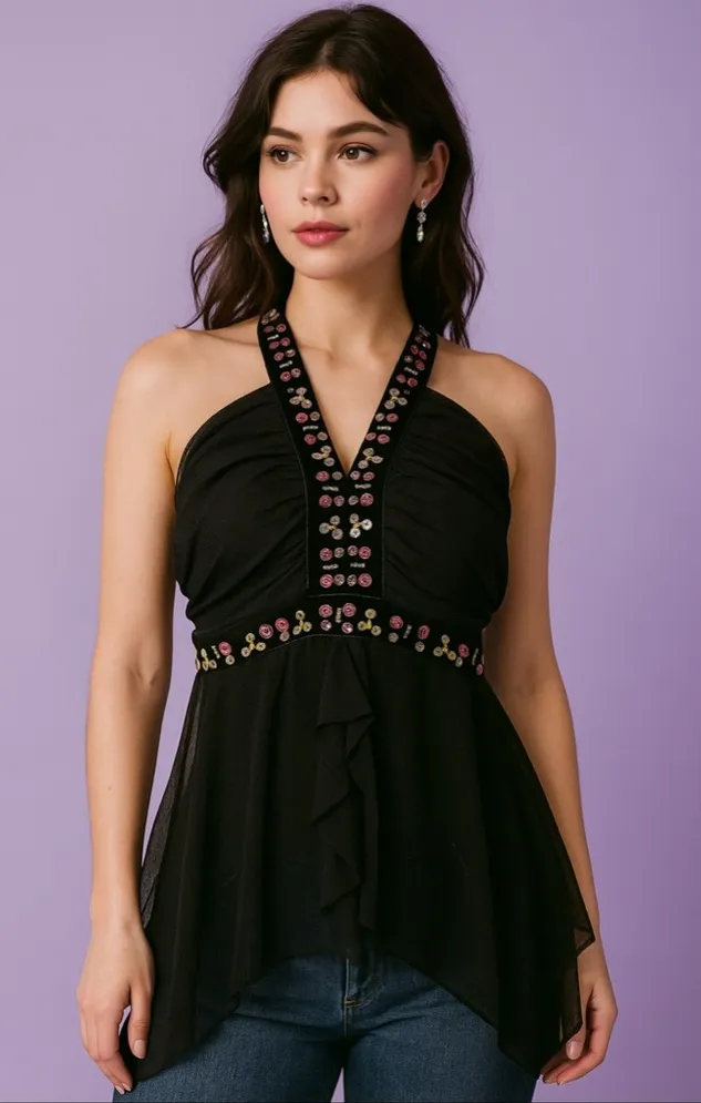 Authentic early-2000s Y2K vintage halter top with deep black velvet and sequin tie bodice, perfectly aligned with today’s Whimsigoth and rich velvet trend wave on Poshmark. Dark Fairy This top blends fairycore romance, goth edge, and flirty Y2K glamour — the kind of statement piece that instantly elevates a night-out or holiday look. Details: • Luxurious velvet trim with sequin-embellished tie bodice • Ruched bust and empire waist for a flattering, feminine shape • Sheer, flowy overlay with asymmetric hem • Fully lined for comfort and coverage • Adjustable halter neckline • Soft, drapey feel with romantic movement Perfect for Whimsigoth outfits, holiday parties, New Year’s Eve, festivals, or styled casually with denim for a flirty, fun Y2K look. Condition: Excellent pre-owned Size: Women’s 14/16 Era: Authentic early 2000s (Y2K vintage) (302)