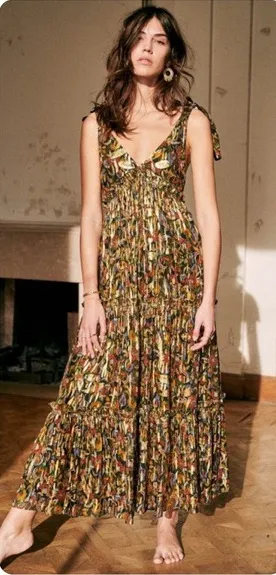 DESCRIPTION - Brand: SÉZANE - Condition: Like-New, No Flaws, No signs of wear - Orig: $245 - Color: Lurex Floral Field Prints - Pockets: None - Closure: Slip-on - Length: Maxi - Lining: Yes - Long dress - V-neckline in front - Adjustable straps to tie - Elastic back for support - Fully Lined - Self: 80% Silk, 20% Metallic Fiber - Lining: 100% Viscose APPROX. MEASUREMENTS: - Size: FR40 = US 8 - Bust: 36” - 38” - Waist: 30” - Hips: 56” - Body Length: 58” Actual item for sale is shown using a mannequin. For sizing reference, our mannequin’s measurements: Bust: 35.5” | Waist: 26.5” | Hips: 38.5” | Height: 5’11