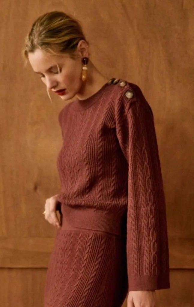 Up for purchase today is... Designer: Sezane Size: XS Fit: Please do not go by size number but rather check measurements listed below to determine if the item will fit. Color: Caramel (brown) Style/Design #: S242PUL123M Material: 47% merino wool, 47% cotton, 5% polyamide, 1% elastane Details: * Cable knit amplifies the coziness of a pullover knit from exquisitely a soft merino wool blend. Crew neck. Button placket fastening on the shoulder. Long wide sleeves. Pull-on. Unlined. Hand wash. Imported. * Condition: New with tags Retail: $185 Measurements: Chest - 32" Waist - 30" Length - 18 ½"