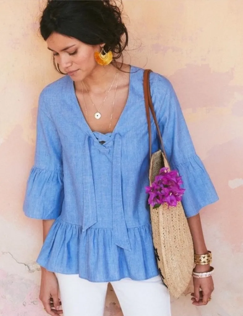 Elevate your everyday wardrobe with this beautiful Sézane Anita chambray blouse, featuring timeless bohemian details and an effortlessly flattering silhouette. Crafted from a breathable cotton-blend chambray, this top showcases a lace-up neckline, 3/4 bell sleeves, and a gathered peplum hem for soft structure and movement. The light blue denim hue makes it endlessly wearable from season to season. Perfect for pairing with high-waisted jeans, trousers, or skirts for a chic French-inspired look. • Brand: Sézane • Style: Anita Top • Size: FR 42 / US 10 • Color: Light blue chambray / denim • Lace-up front neckline • 3/4 length bell sleeves • Gathered peplum hem • Pullover style • Bohemian / feminine silhouette Fabric: • 60% Cotton • 20% Lyocell • 20% Linen Lightweight, breathable chambray blend Preowned no flaws. Flatlay Measurements (approximate) Chest 21 inches Length 25.5 inches Sleeve from underarm 10 inches Waist 22.5 inches Width at peplum 24 inches Sézane Anita top, chambray blouse, denim peplum top, lace up blouse, bell sleeve top, boho French style, linen cotton top, size 42 Sézane, US 10 women’s top