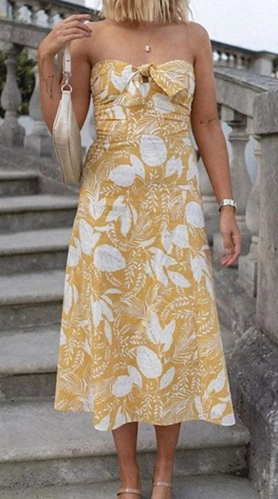 Sezane Beatriz Linen strapless midi Dress in Yellow Floral. Strapless 55% linen, 45% Cotton. Lining... Show more