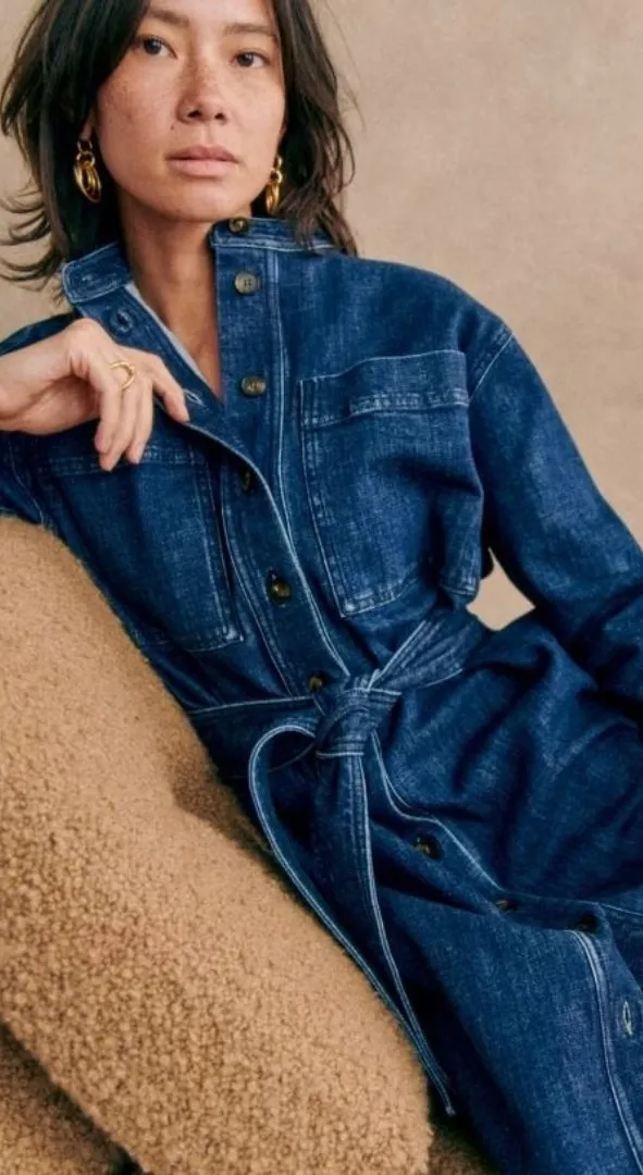 Sezane "Navi" long sleeve dark wash denim midi shift dress. Button down with patch pockets on the ch... Show more