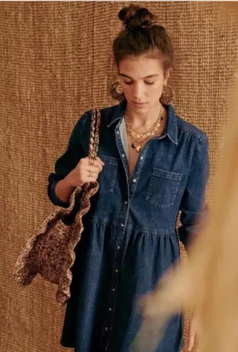 Description EUC - worn once - excellent condition Size: 36/US 4 Color: Dark Blue Denim Short dress with long sleeves Loose fit Shirt collar Gathered cut-out at the waist Front and cuffs fastened with snaps Patch pockets on the chest Unlined 78% cotton, 20% recycled cotton, 2% elastane Measurements: Bust: approx. 19.5" (laying flat); Waist: approx. 18" (laying flat); Length: approx. 33.5"