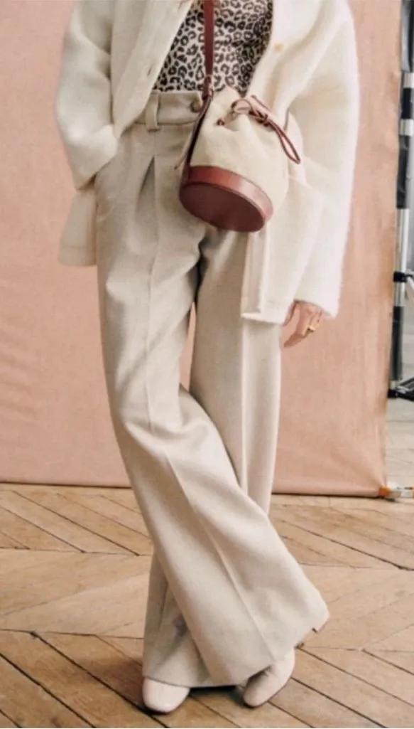— Gently used, minor fuzzies and tiny spots by knee area Neutral beige Wide leg High waist Zipper & button closure on outside & inside Fully lined Pleated front Side Pockets Welt back pockets 60% wool 25% polyamide 10% cashmere 5% polyester 100% viscose lining — Business work office career dress pants boho classy classic closet staple minimalist winter spring rare preppy old money academia capsule wardrobe