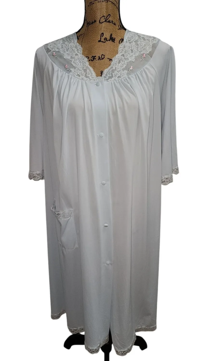 Vintage Shadowline nightgown, a charming addition to your sleepwear collection. This light blue nightgown features delicate lace trim around the neckline, cuffs, and pocket, accented with sweet floral embroidery. The button-front design adds a touch of classic elegance, while the soft fabric ensures a comfortable fit. Type: Gown Department: Women Color: Blue Style: Chemise Pattern: Floral Material: Nylon Character: Belle, Snow White, Sophie, Jane, Glory Fabric Type: Lace Sleeve Length: 3/4 Sleeve Character Family: Disney Princess, Friends, Charmed, Heroes, Home Season: Spring, Summer Closure: Button Keywords: vintage nightgown, lace nightgown, Shadowline nightgown, floral embroidery, lingerie, loungewear, sleepwear, button front nightgown, light blue nightgown, vintage lingerie, retro nightgown, classic nightgown, embroidered nightgown