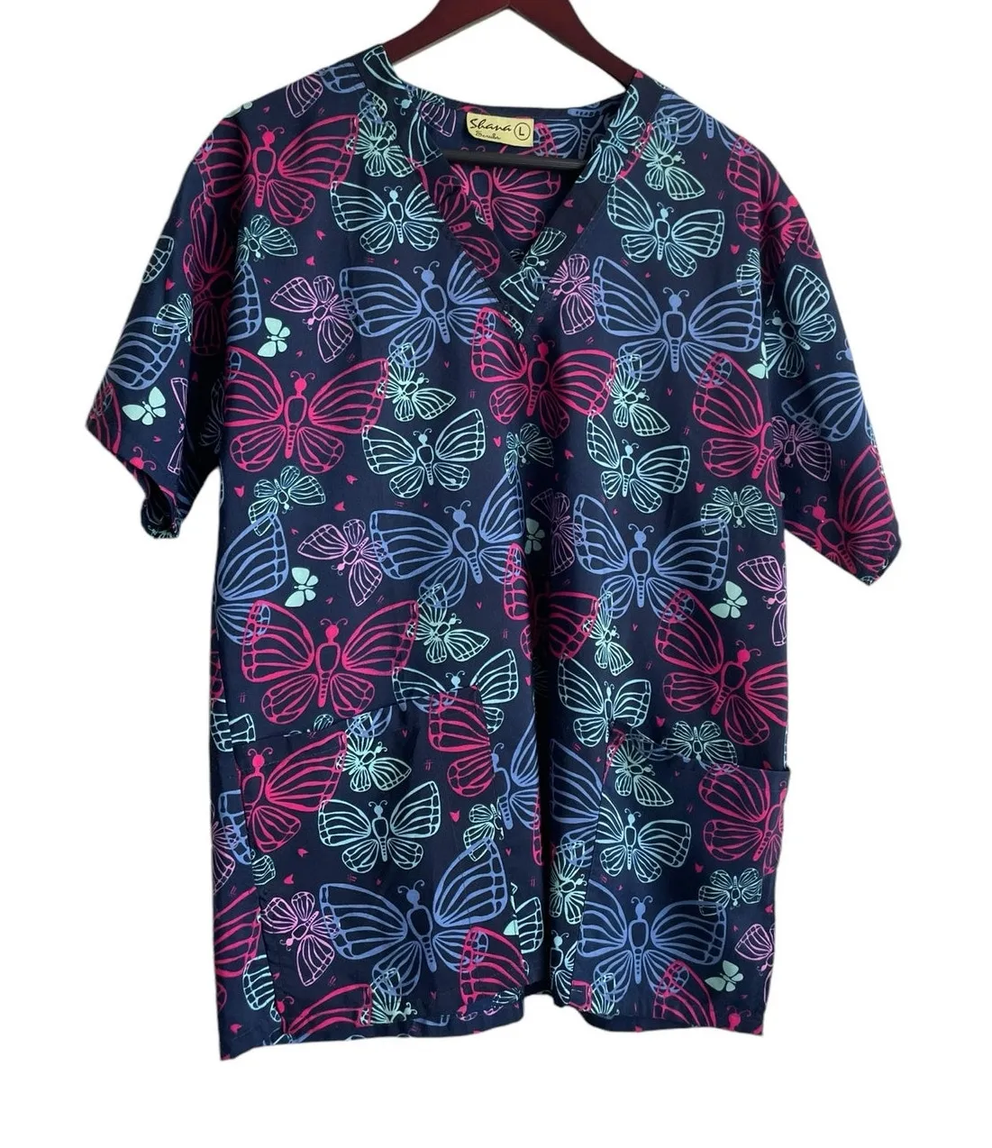 Shana Women Scrub Top L Navy Butterfly Medical Uniform Nurse Workwear Dental Workwear Well cared for condition - no flaws noticed Features:: (First picture truest color) -lightweight -v-neck -pockets -short sleeve -relaxed silhouette -polyester viscose blend, machine wash Style Profile: comfortable, easy care, packable, feminine, versatile, stylish Approximate Measurements: flat lay: * SEE MEASUREMENTS IN PHOTOS *Pet/smoke free home *1-2 day shipping *Bundle and Save