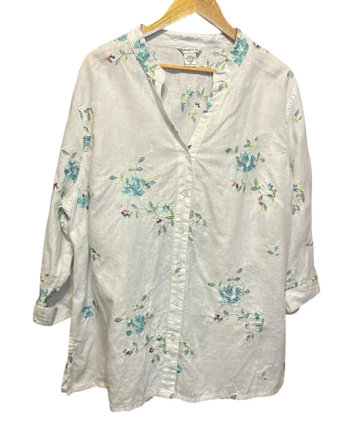 Shanghai Red Women Tunic Top 3X White Embroidered Floral Linen Boho Cottagecore Great Pre-Owned Condition - See Pictures for Details Details: (First picture truest color) -mandarin band collar -split v-neck -3/4 cuffed sleeve -button up closure with clear decorative buttons -pastel embroidered all over flower print -light weight -straight silhouette -100% line, dry clean Style Profile: comfortable, packable, feminine, versatile, stylish, work, weekend, vacation, natural fabric, classic, sustainable, brunch, beach, cover up, summer party, casual layering, garden party Approximate Measurements: flat lay: armpit to armpit: 28“ hem:30 " length: 38“ Pet/smoke free home 1-2 day shipping Bundle & Save