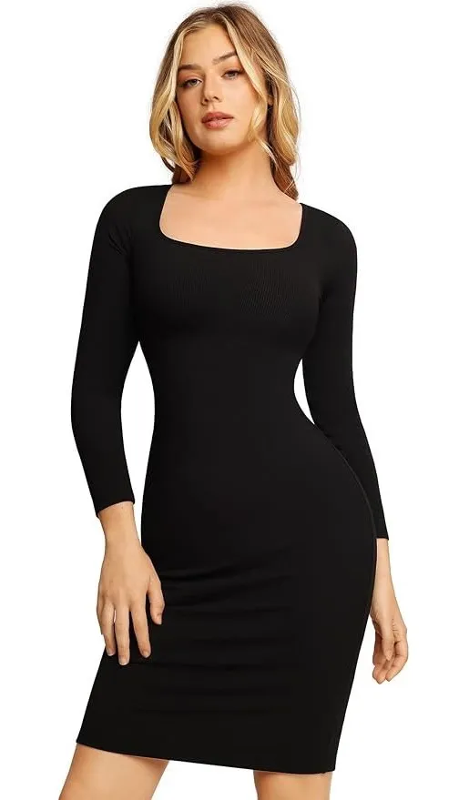 Built-In Shapewear: The bodycon dress with built-in bra offers all-day comfort. The double-layer fabric provides tummy control and a lift for your hips. An anti-chafing feature of the shapewear ensures all-day comfort. Gently used in excellent condition Approximately measurements Chest 16" Waist 14" Length 40" Keywords: SHAPER dress, long sleeve dress, square neck dress, midi dress, bodycon dress, ribbed dress, shapewear dress, black dress, comfortable, versatile, layering piece, minimalist, basic dress