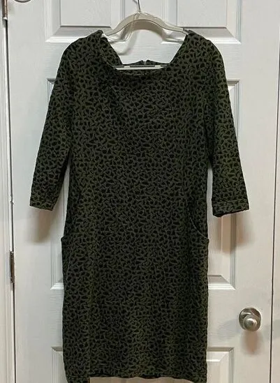 Envision yourself in this sophisticated Sharagano dress, a statement piece that effortlessly blends comfort and style. The olive green hue, adorned with a subtle animal print, offers a touch of wild elegance, while the flattering silhouette and 3/4 sleeves provide a refined look. Practical pockets add a functional flair, making it perfect for busy days. Imagine wearing this dress to a business meeting, a casual lunch with friends, or even a relaxed evening event – its versatility ensures you'll always be dressed to impress. Keywords: Sharagano dress, olive green dress, animal print dress, career dress, office chic, business casual dress, workwear dress, size large dress, 3/4 sleeve dress, dress with pockets, knee length dress, fall fashion, minimalist aesthetic, sophisticated style, womens office dress, comfy stretch dress