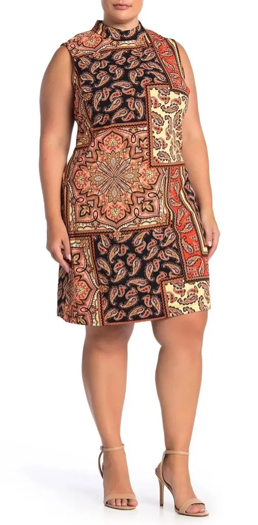 This is a Sharagano Paisley Boho Chic Sheath Dress with a mock neck and patchwork print. Size 22W New with tags MSRP $109 Black/orange in a color Gorgeous pattern throughout Zip up back Measurements are as follows Pit to pit 24.5” Length 41.5” Location C
