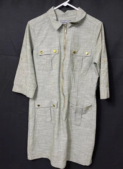 This Sharagano utility dress, size 12, features a functional design with a zip front and gold button... Show more