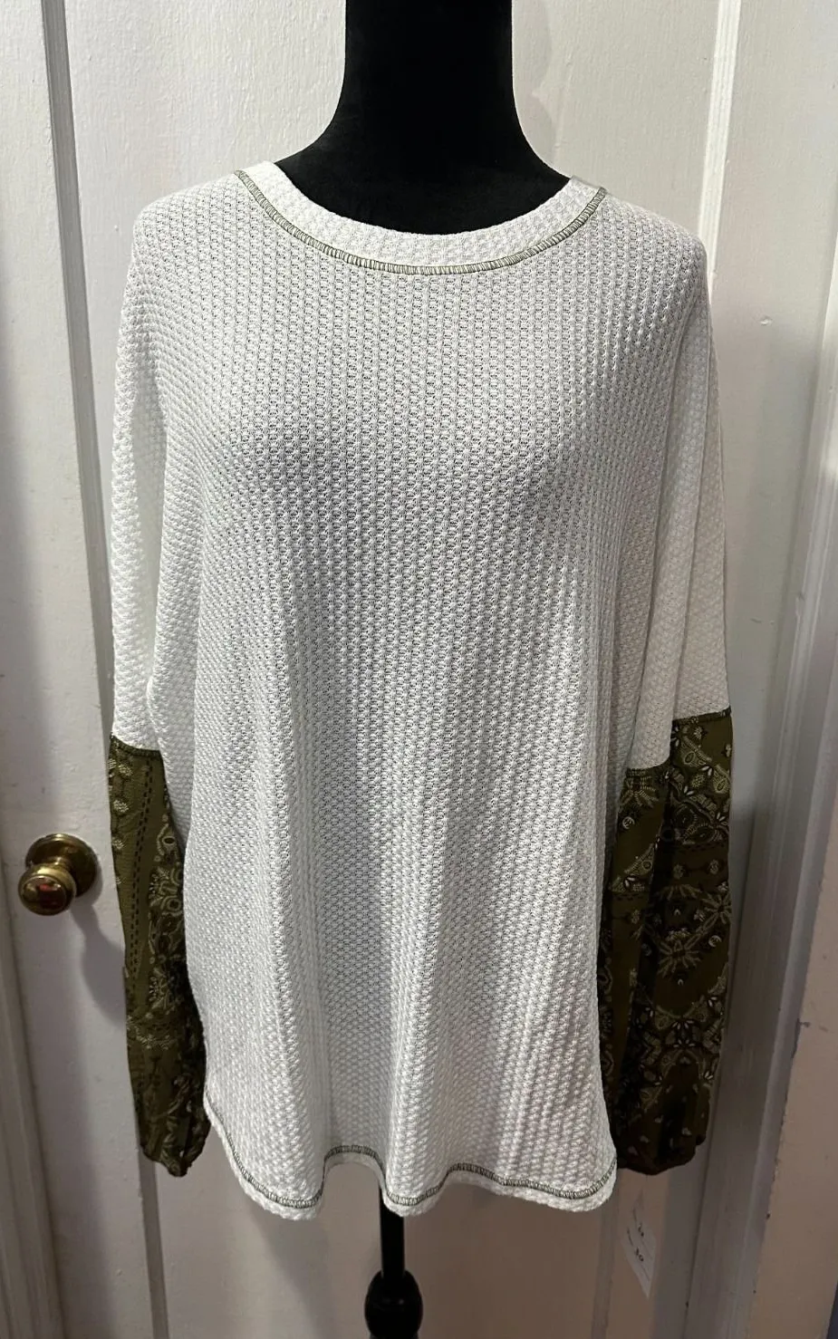 The She & Sho White Waffle Knit Top with Green Paisley Sleeves in 2X is a stylish and versatile blou... Show more