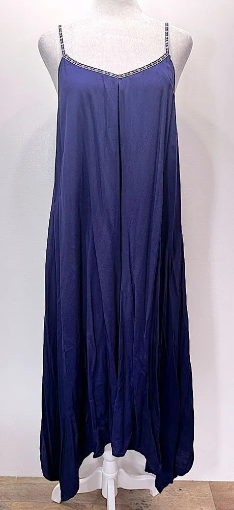 She + Sky Navy Blue Asymmetric Handkerchief Hem Dress with Boho print adjustable spaghetti straps. L... Show more