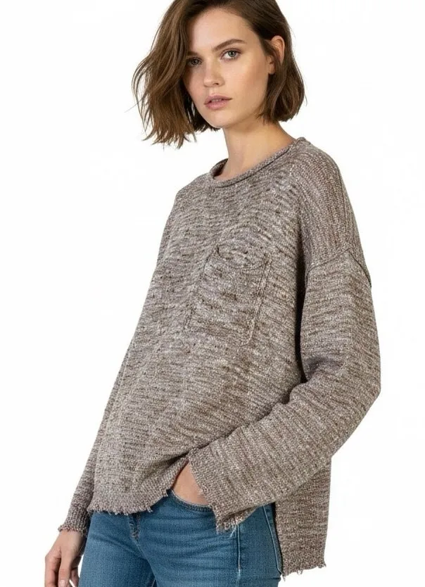 Bouclé textured knit Pullover style Crew neckline Long sleeves Raw edges Front chest pocket Relaxed... Show more