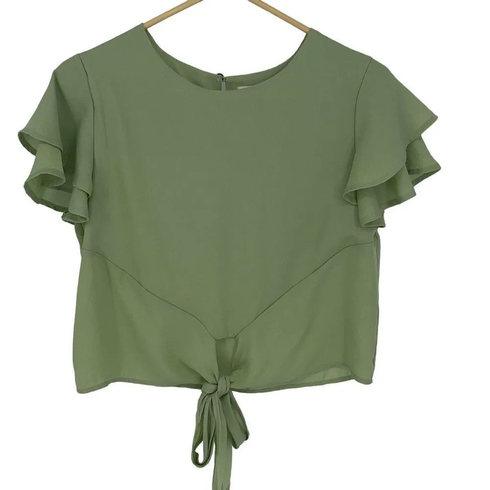 Description: She + Sky Womens Cropped Ruffled Tiered Short Sleeve Blouse Tie Front Green Size Small... Show more