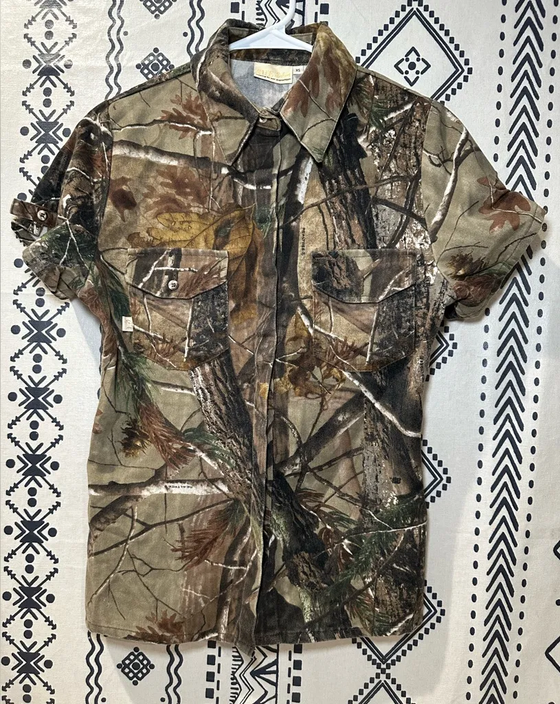 This SHE Safari Outdoor REALTREE Camo Short Sleeve Button Down Shirt in size XSmall is the perfect addition to your hunting wardrobe. The shirt features a brown color with a She Safari Real Tree Camo pattern, made from high-quality down material. The short sleeve design and button-down style make it suitable for any hunting activity, and the XS size is perfect for women. This hunting shirt is a must-have for anyone who loves the outdoors and wants to stay comfortable while exploring. The shirt is made from durable material and is designed to withstand the toughest conditions. Whether you're hiking in the mountains or hunting in the woods, this shirt will keep you warm and comfortable. Get yours today and experience the ultimate hunting shirt. Item is used and in good used condition. Item comes as shown - all buttons are intact and no holes.