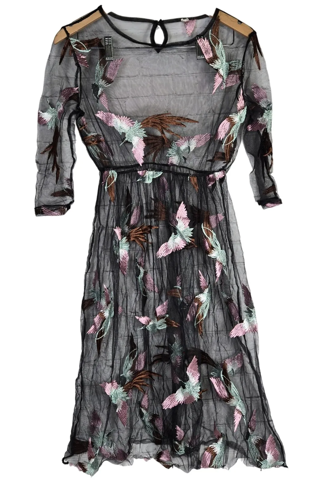 Sheer Black Embroidered Bird Midi Dress Women's Mesh Long Sleeve Keyhole Button Tagged info: Size:... Show more