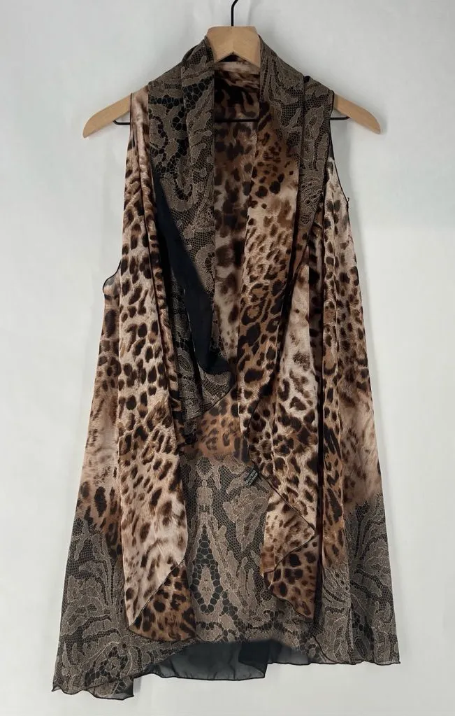 Sheer Chiffon Leopard Print Sleeveless Draped Open Front Topper Layering Piece Elevate your style with this chic leopard print sleeveless top. Perfect for any occasion, this top offers a bold and fashionable look. graphic lace and leopard print combo draped open front topper layering piece 2033